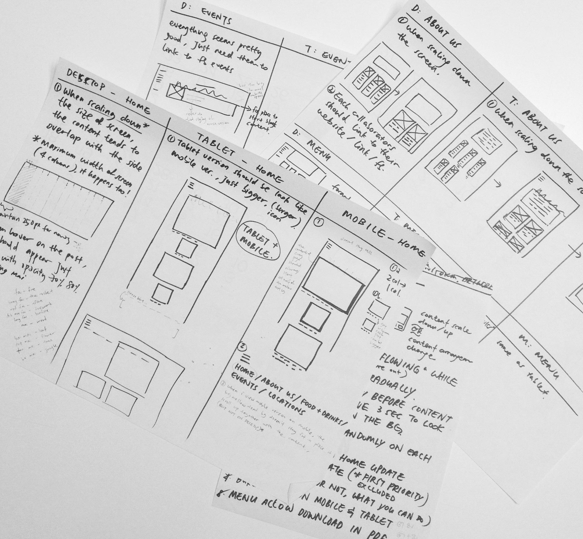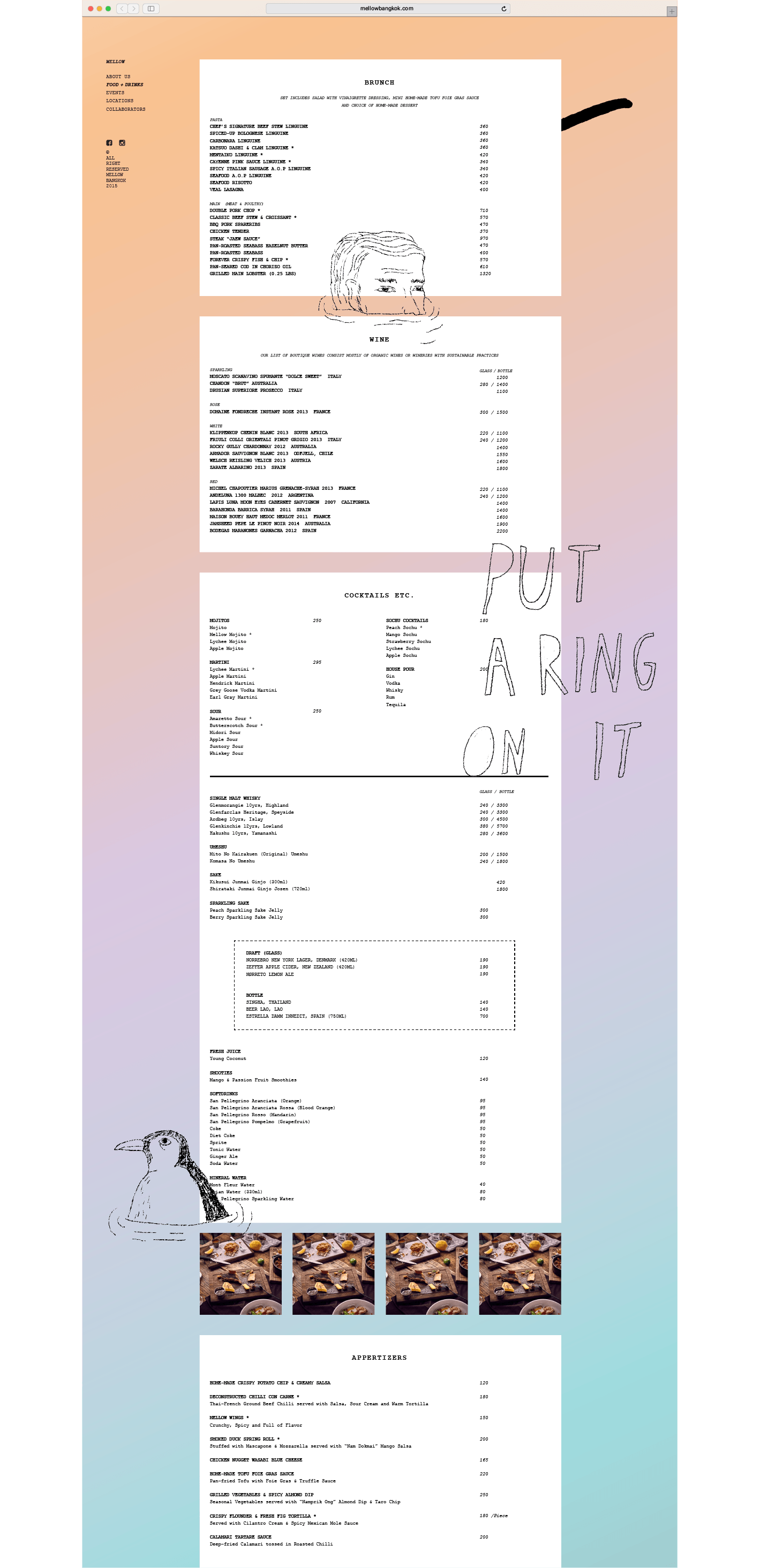 We wanted to keep the cool mellowy vibe for the website, but with an extra touch of uniqueness. Hence the oldschool side navigation bar, and content on the right side. The gradient background was pulled from the printed menu.