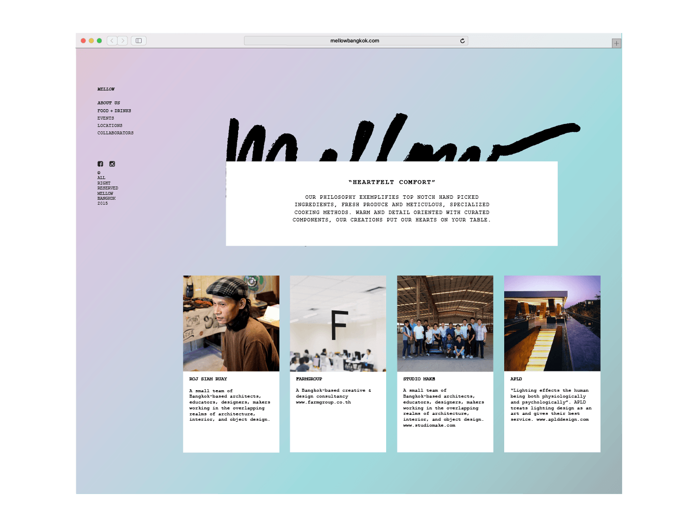 "Heartfelt Comfort" in the food and mellow in the mood. Farmgroup was commissioned to create a brand identity, restaurant interior and website for Mellow Restaurant and Bar. I was lucky enough to be fully involved on this project, specifically on the website.